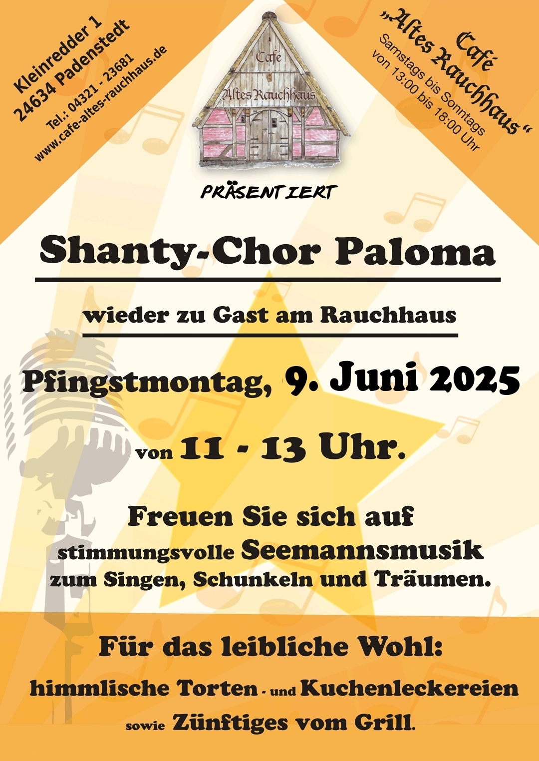 Kommt vorbei am Pfingstmontag 09.06.2025 von 11 – 13 Uhr singt der Shantychor für uns, es gibt Feines vom Grill, Salate und kühle Getränke, natürlich eine große Tortenauswahl und vieles mehr.
