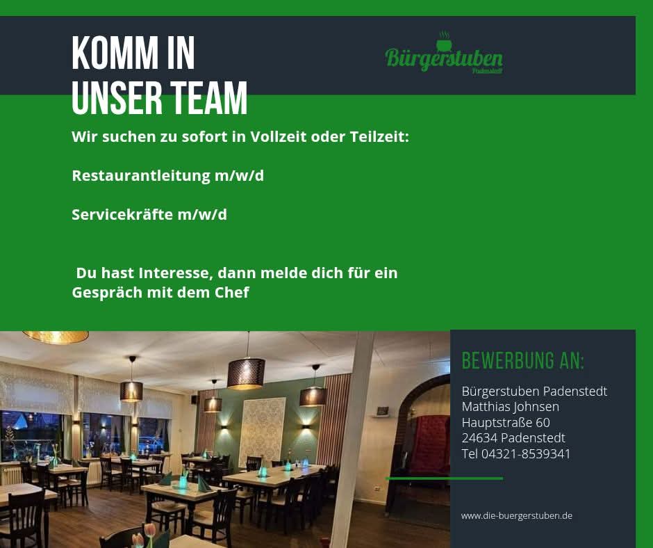 Bürgerstuben Padenstedt – Dein neuer Arbeitsplatz mit Herz Wir sind ein familiär geführtes Restaurant mit Leidenschaft für gute Küche und echten Teamgeist. Wenn du Lust auf einen sicheren Arbeitsplatz mit netten Kolleg:innen, fairer Bezahlung und einem wertschätzenden Miteinander hast – dann werde Teil unseres Teams! |