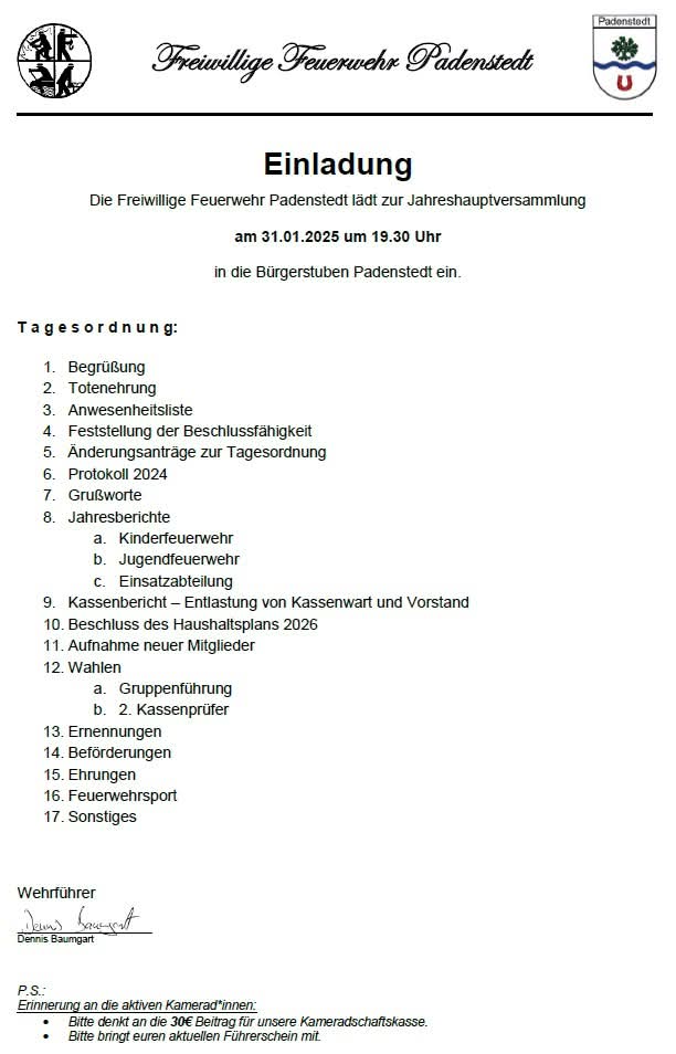 Jahreshauptversammlung Feuerwehr Padenstedt