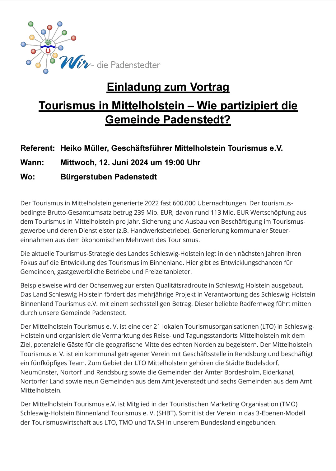 Vortrag: Tourismus in Mittelholstein – Wie partizipiert die Gemeinde Padenstedt?