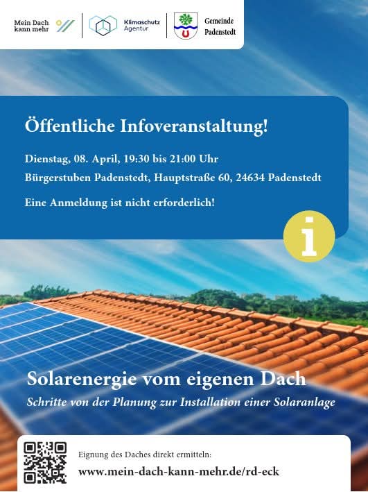 In Zeiten der Energiewende wird eine autarke Energieversorgung für viele Menschen immer wichtiger, immer häufiger sind Solaranlagen auf den Dächern von Ein- und Mehrfamilienhäusern auch in Schleswig-Holstein zu sehen. Aber welchen Beitrag für den Klimaschutz leisten diese Anlagen und rechnen sie sich? Welche Dächer sind für Solaranlagen geeignet und welche Anlagenkombination ist die beste? Welche neuen Entwicklungen gibt es in der Photovoltaik und wo kann ich mich über Solaranlagen informieren und beraten lassen? Die Klimaschutzagentur und die Gemeinde Padenstedt möchten an diesem Abend das Potenzial der Sonne darstellen und laden alle Interessierten herzlich zu diesem kostenlosen Informationsabend ein.